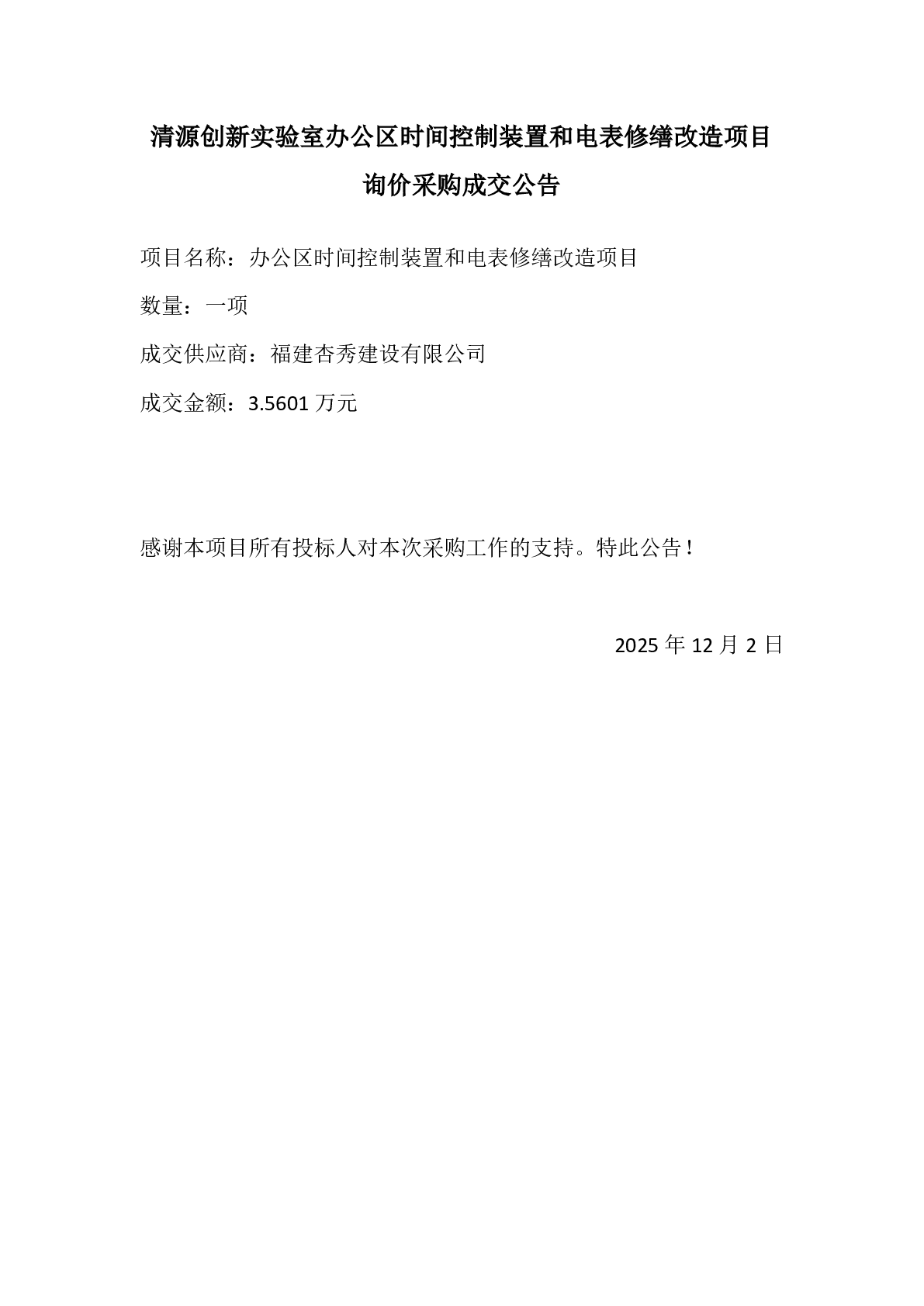 清源创新实验室办公区时间控制装置和电表修缮改造项目询价采购成交公告